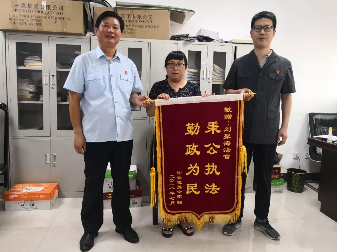 7月31日一早,申请执行人许某家属早早来到卫东区人民法院执行局,将一面“秉公执法,勤政为民”的锦旗送到执行法官刘聚海手中,以此表达对卫东区人民法院执行工作的认可与感谢。